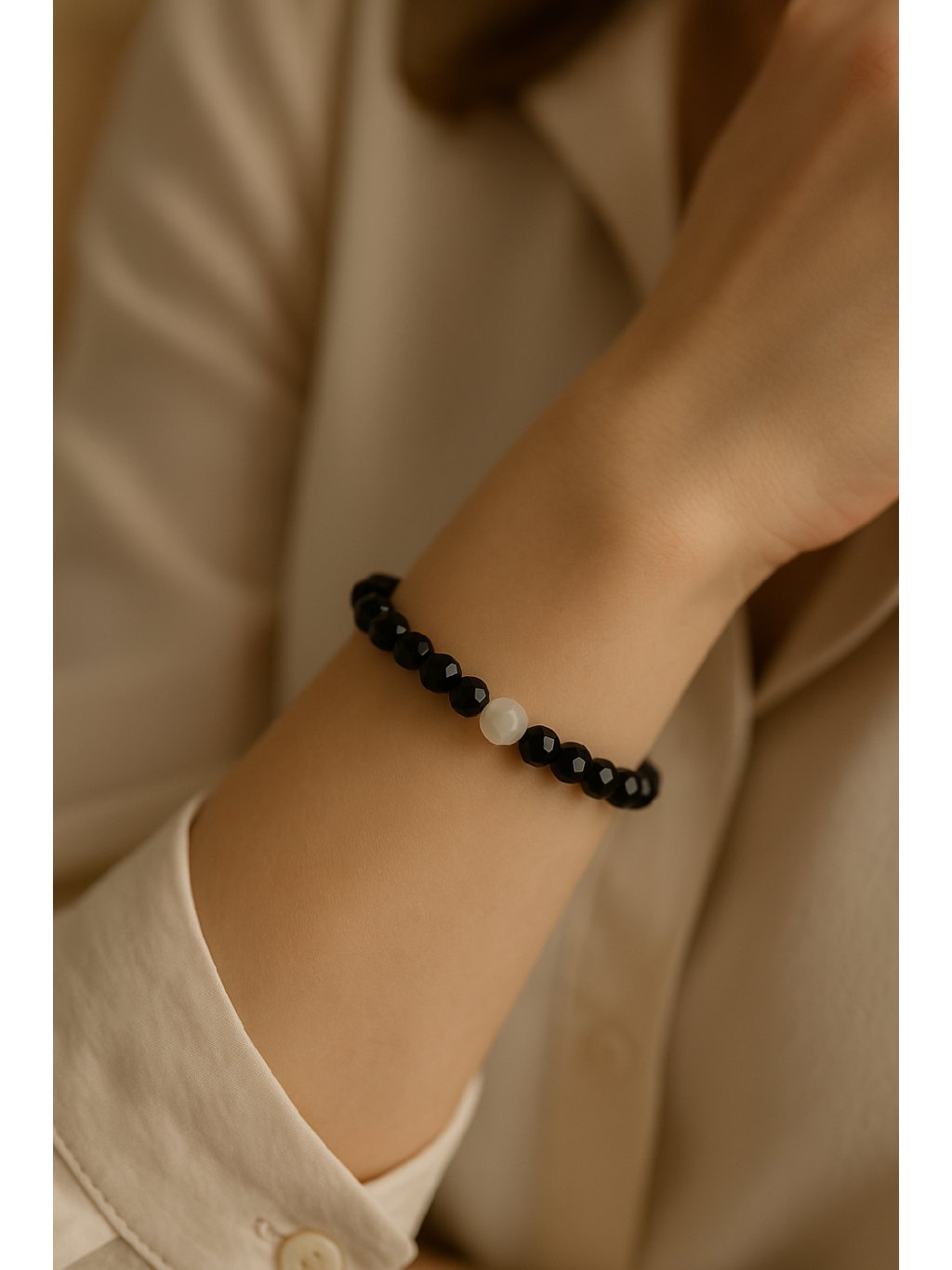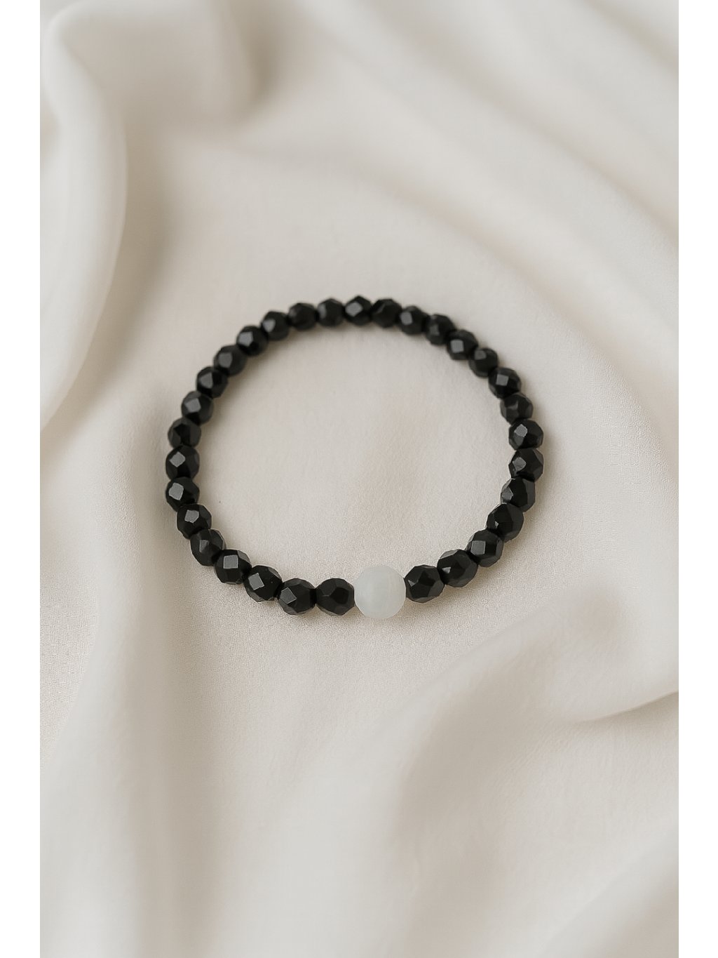 Elegantní náramek Luna je inspirován silou a krásou měsíčního světla. Bílý korálek uprostřed představuje samotný Měsíc – čistý, klidný a zářící v temnotě. Obklopují ho černé fazetované korálky, které vytvářejí dokonalý kontrast a podtrhují jeho jemnost. Luna je šperkem, který v sobě nese klidnou energii noci a tichou sílu světla.