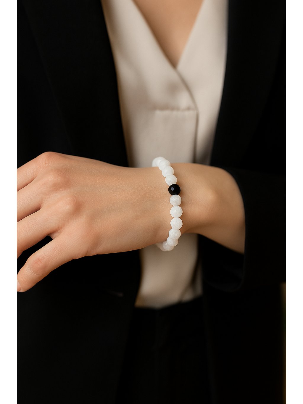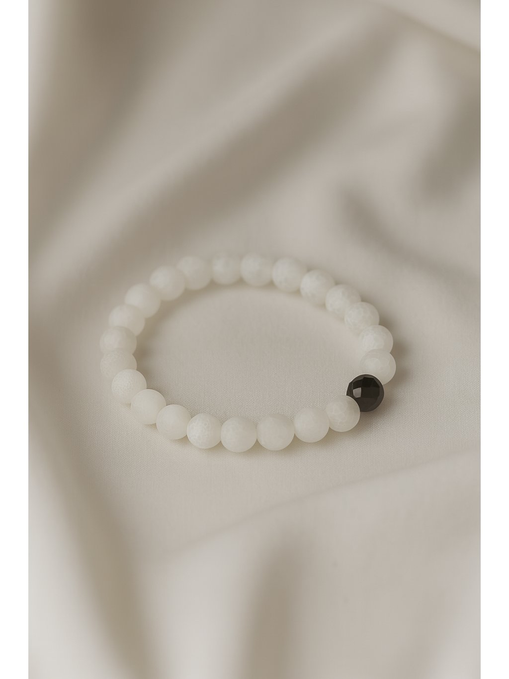 Náramek je tvořen jemnými, bílými korálky, které působí čistě a luxusně. Dominantní černý detail dodává kontrast a hloubku – decentní, ale nepřehlédnutelný prvek. Ideální pro ty, kdo milují minimalismus, který zaujme, aniž by rušil. Vyvážený šperk pro každý den i výjimečné chvíle