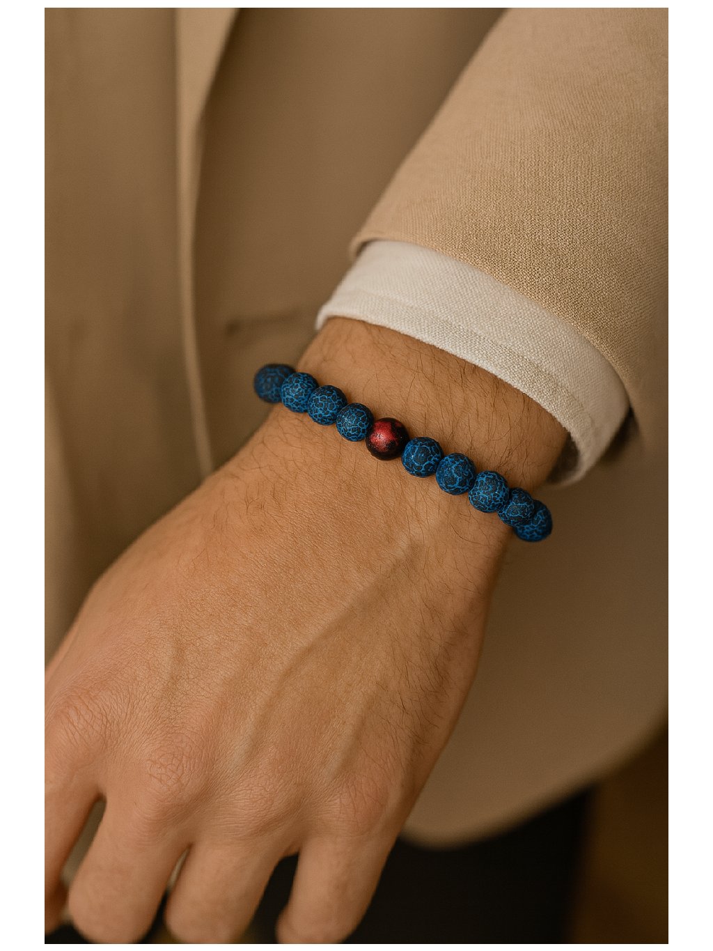 Náramek Blue Flame je symbolem tiché síly a vnitřní energie. Sytě modré korálky s krakelovanou strukturou připomínají klidný oheň, který nehlučí, ale hoří. Jediný červený kámen ve středu nese význam vášně, odvahy a srdce. Tento výrazný, a přesto harmonický doplněk je navržen pro ty, kteří v sobě nosí sílu, která nepotřebuje křičet.