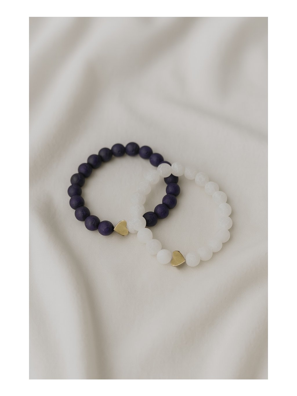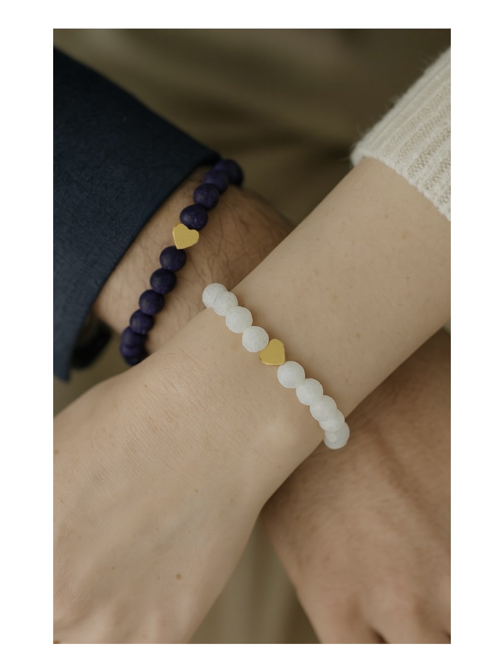 Dva náramky, dvě duše – propojené zlatým srdcem. Elegantní kombinace fialových a bílých minerálních korálků symbolizuje rovnováhu a vzájemnou oporu. Každý náramek je jedinečný, stejně jako vztah, který reprezentuje. Ideální pro páry, které chtějí nosit nenápadný, ale silný symbol své blízkosti – spojení, které je vidět i cítit.